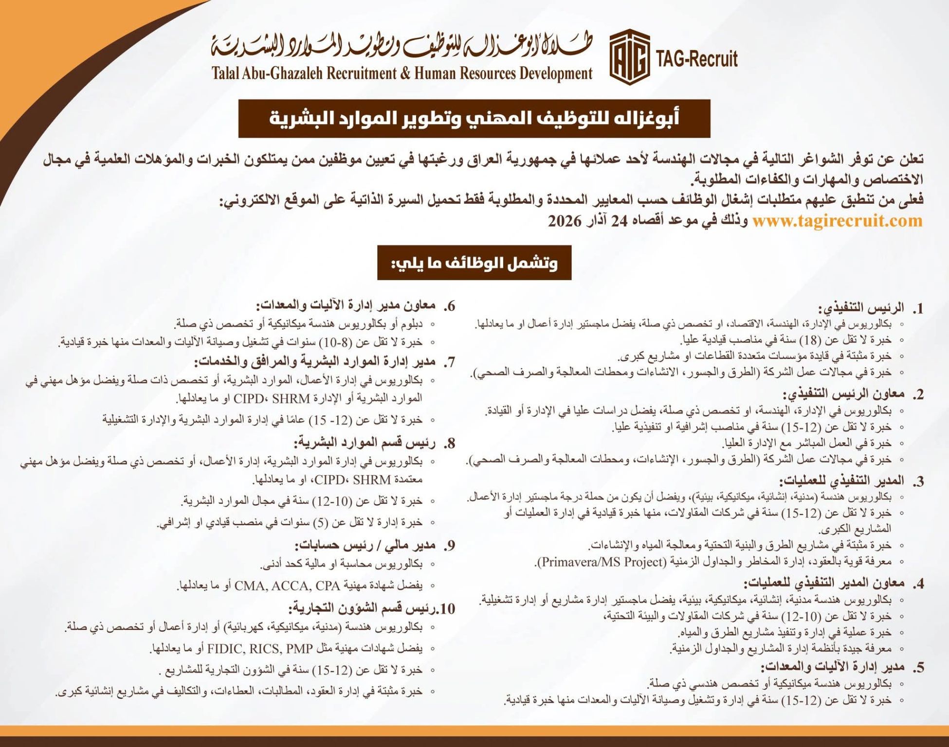 تعلن طلال أبوغزالة للتوظيف وتطوير الموارد البشرية (TAG-Recruit) عن توفر شواغر قيادية وهندسية للعمل لدى أحد عملائها في جمهورية العراق ضمن مشاريع استراتيجية في الطرق والجسور والبنية التحتية ومحطات المعالجة.
