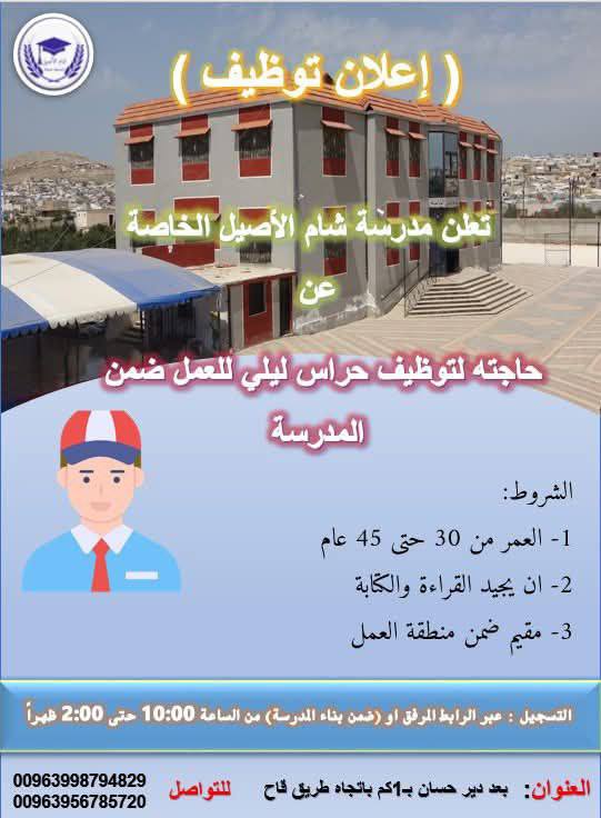 🚨 توظيف فوري: حارس ليلي في مدرسة شام الأصل الخاصة