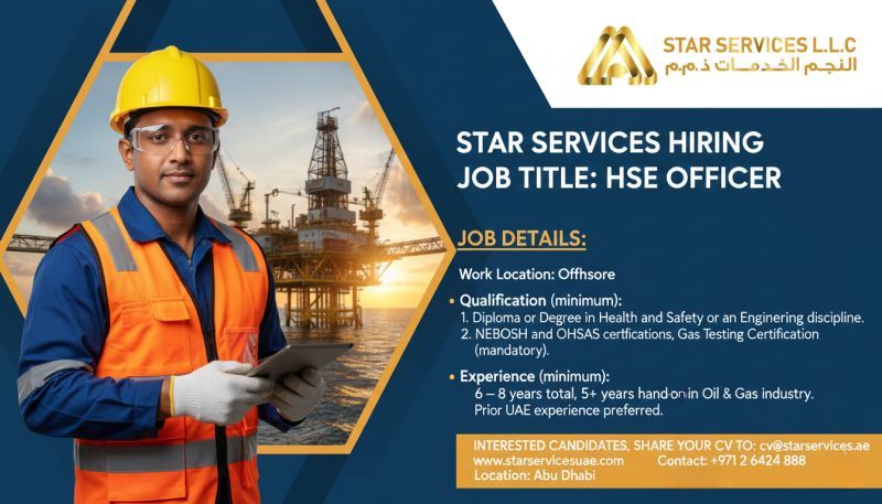 تعلن Star Services L.L.C عن فتح باب التوظيف لشغل وظيفة HSE Officer للعمل في موقع Offshore ضمن بيئة احترافية في قطاع النفط والغاز مع فرص نمو مهني حقيقية.