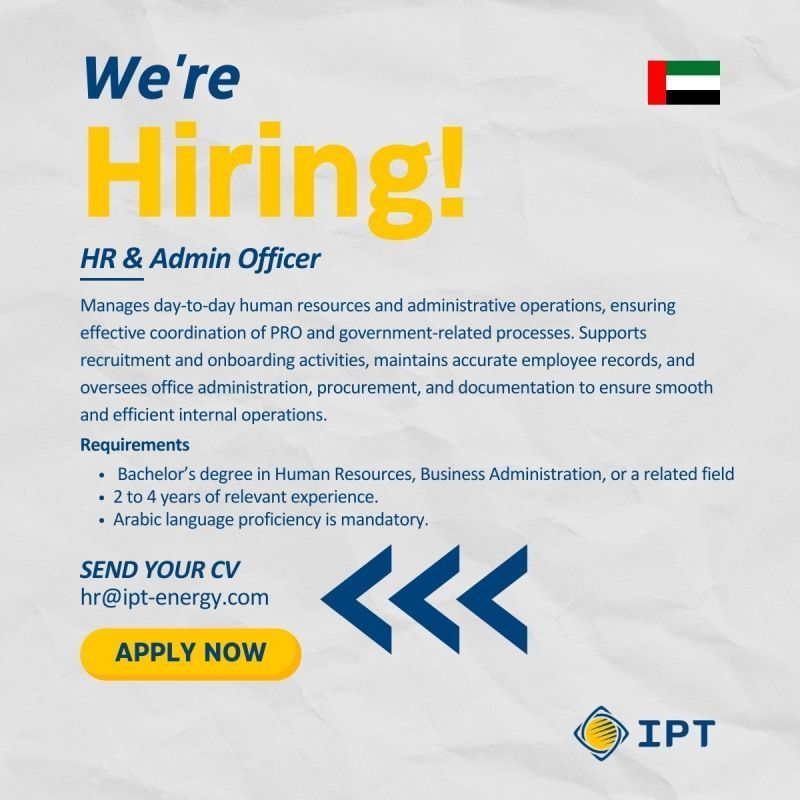 تعلن شركة IPT Energy عن فتح باب التوظيف لشغل وظيفة HR & Admin Officer ضمن بيئة عمل احترافية تدعم النمو والاستقرار الوظيفي.