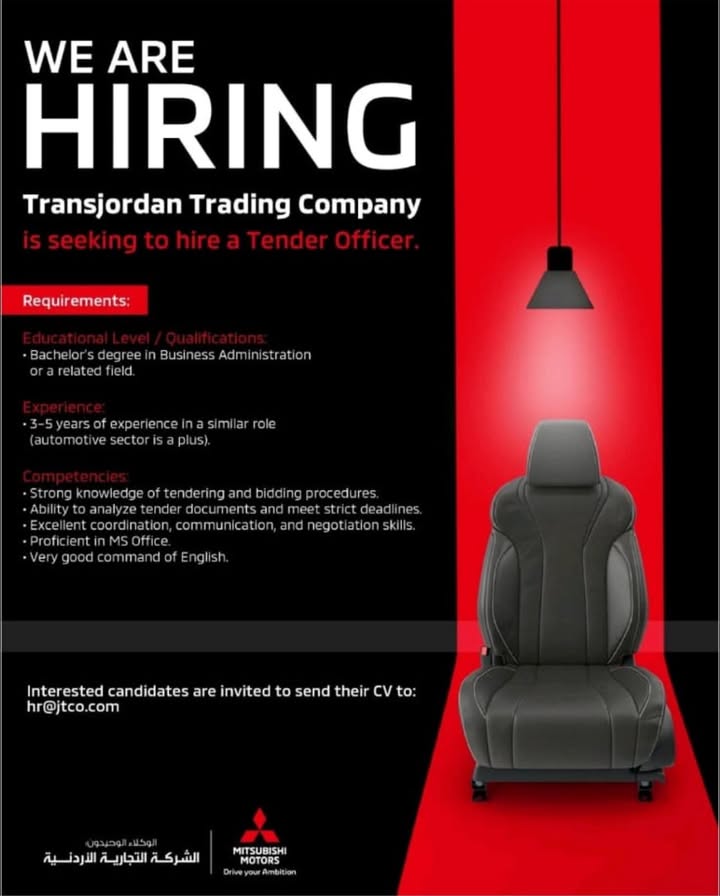 تعلن Transjordan Trading Company (الشركة التجارية الأردنية) عن فتح باب التوظيف لشغل وظيفة مسؤول عطاءات (Tender Officer) ضمن بيئة عمل احترافية توفر استقرارًا ماليًا ونموًا مهنيًا طويل الأمد.