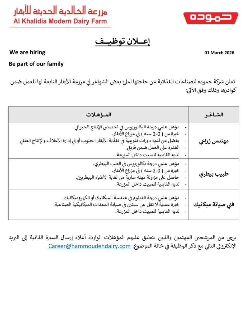 تعلن مزرعة الخالدية الحديثة للأبقار – شركة حموده للصناعات الغذائية عن فتح باب التوظيف لشغل وظيفة مهندس زراعي (إنتاج حيواني) ضمن بيئة عمل احترافية توفر استقرار مالي ونمو مهني طويل الأمد.