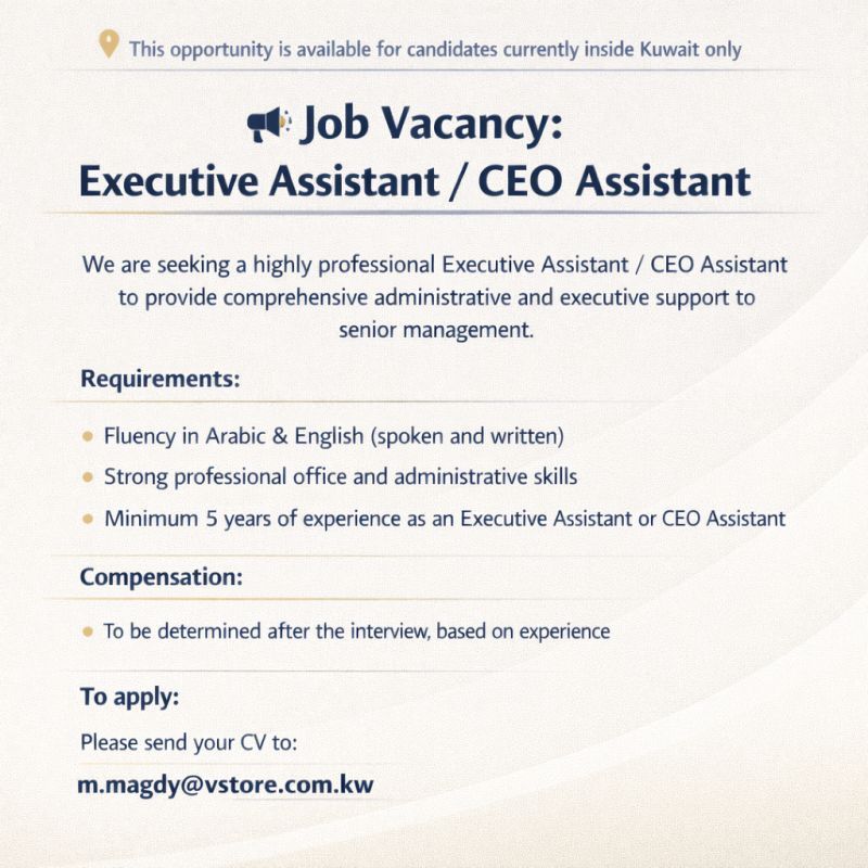 🚨 توظيف فوري في الكويت: Executive Assistant / CEO Assistant