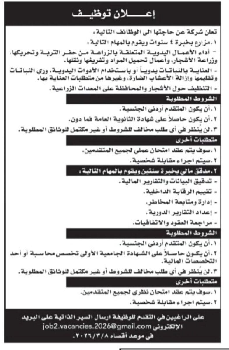 🚨 توظيف فوري: مهندس زراعي ومدقق مالي – العدد محدود