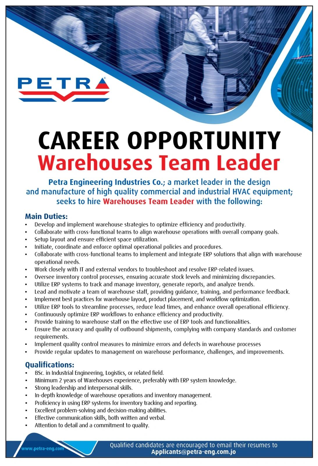 🚨 توظيف فوري: Warehouses Team Leader – العدد محدود