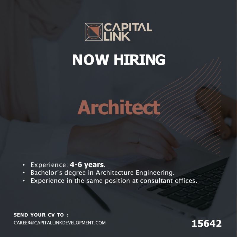 تعلن Capital Link Development عن فتح باب التوظيف لشغل وظيفة مهندس معماري (Architect) ضمن فريقها الهندسي باحترافية عالية وبيئة عمل مستقرة توفر نموًا مهنيًا طويل الأمد.