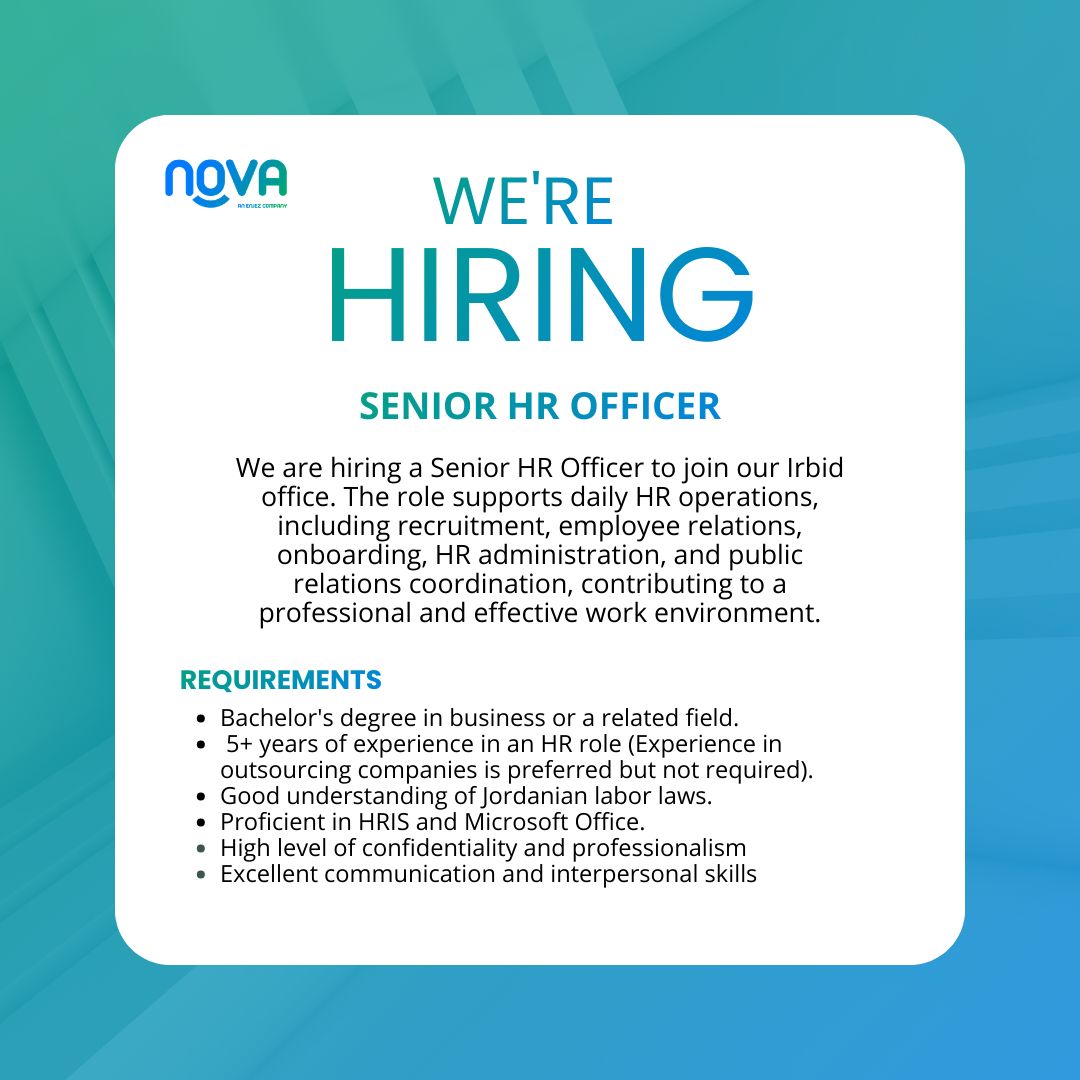 تعلن Nova Call Center Services عن حاجتها لتعيين كبير موظفي الموارد البشرية للعمل في مكتبها بمدينة إربد.