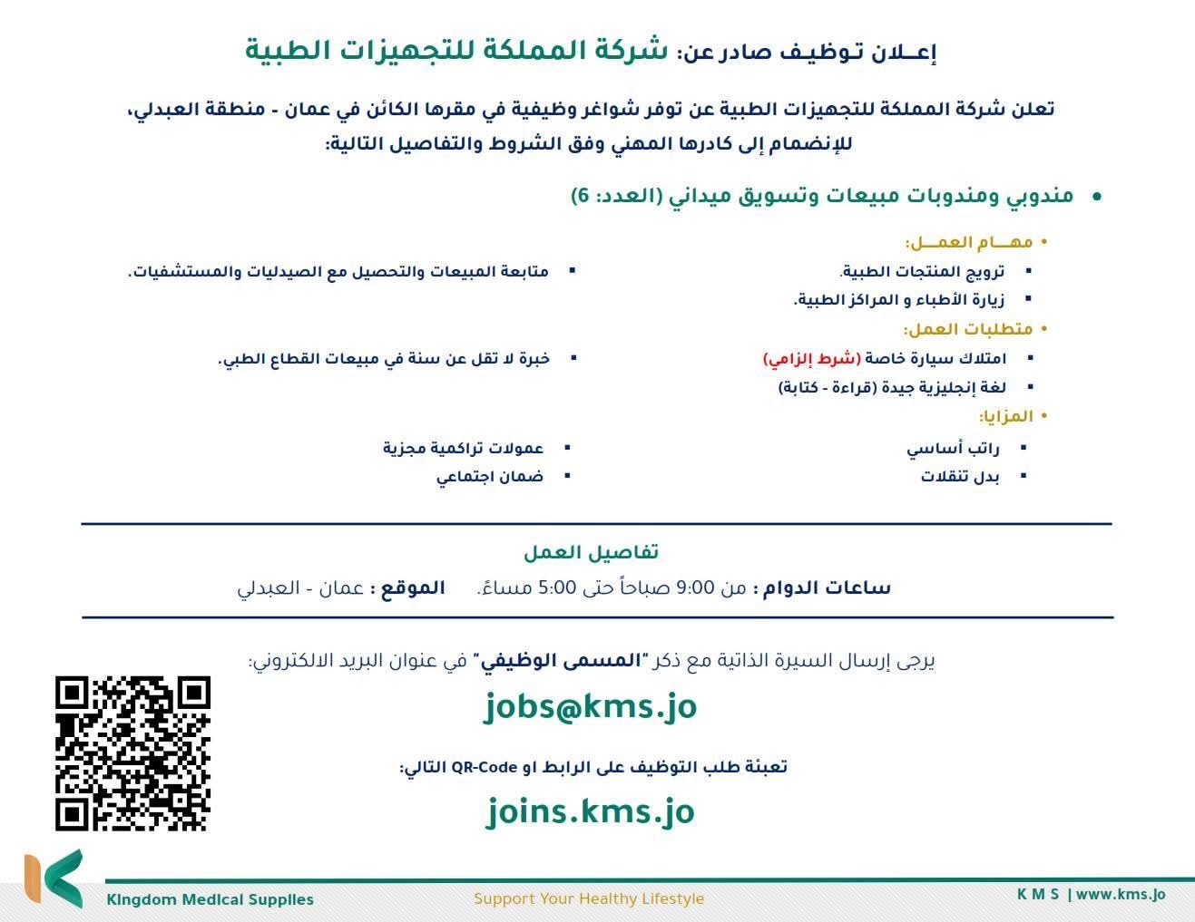 تعلن شركة المملكة للتجهيزات الطبية (KMS – Kingdom Medical Supplies) عن حاجتها لتعيين: