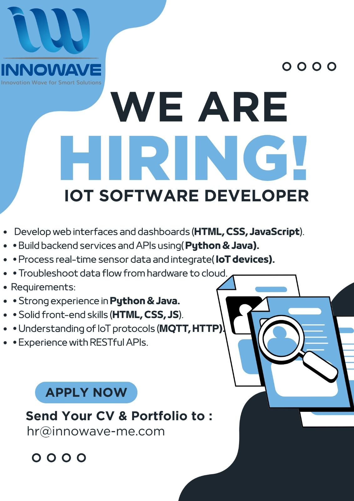 تعلن شركة Innowave عن فتح باب التوظيف لشغل وظيفة IoT Software Developer للعمل بدوام كامل (On-site) ضمن فريق تقني متطور يعمل على دمج البرمجيات مع أنظمة الأجهزة الذكية في مشاريع حقيقية.