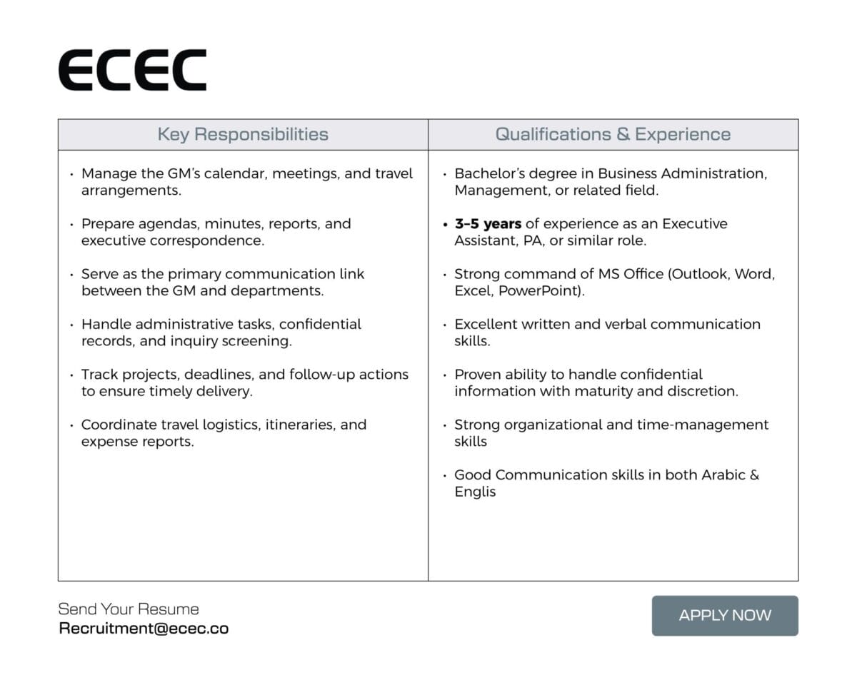 تعلن شركة ECEC عن فتح باب التوظيف لشغل وظيفة Personal Assistant (PA) to the General Manager للعمل بنظام Onsite في عمان، ضمن بيئة عمل احترافية تتطلب دقة عالية وسرية تامة.