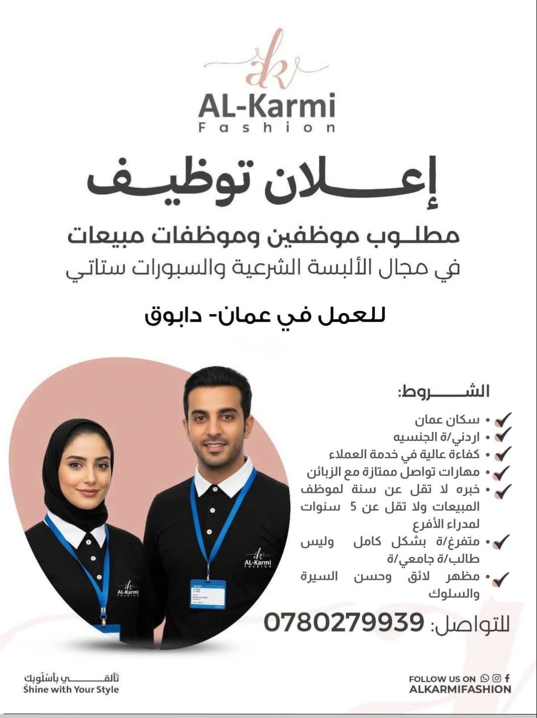 تعلن Al‑Karmi Fashion عن فتح باب التوظيف لتعيين موظفين وموظفات مبيعات في مجال الألبسة الشرعية والسبورات ستايل للعمل في **عمّان – منطقة دابوق.