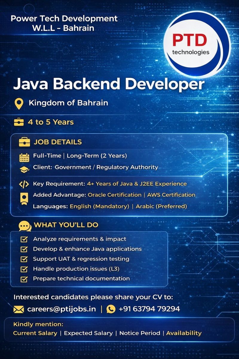 أعلنت شركة Power Tech Development W.L.L عن فتح باب التوظيف لوظيفة Java Backend Developer للعمل في مشاريع تقنية متقدمة داخل Bahrain.