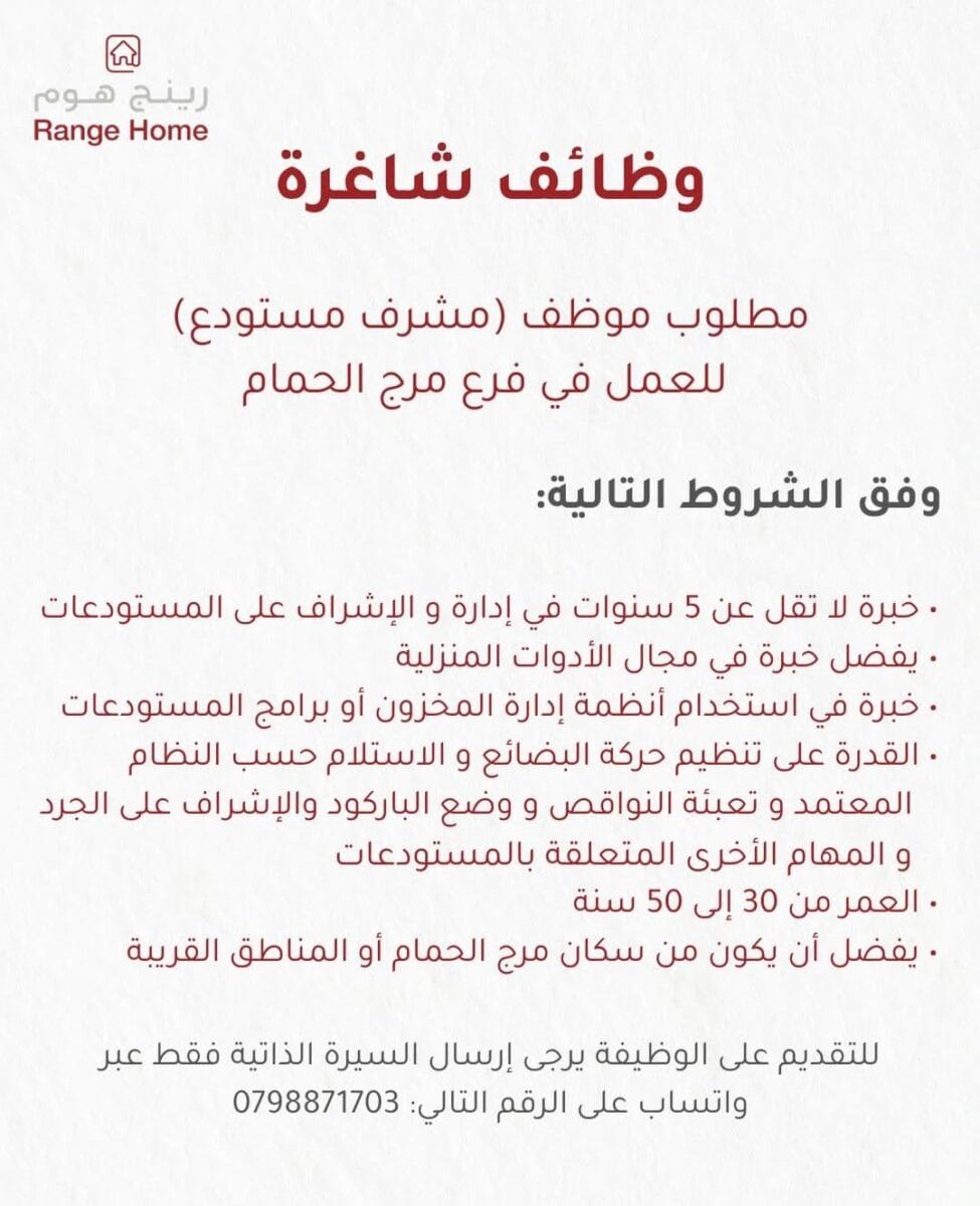 🚨 توظيف فوري: مشرف مستودع في مرج الحمام – العدد محدود