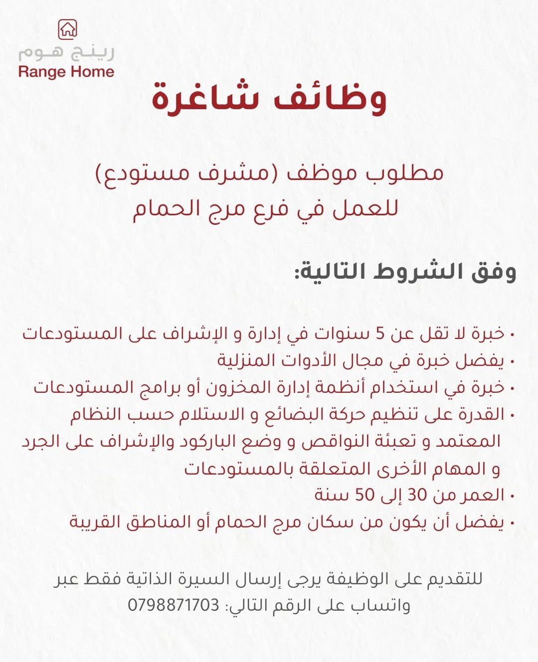 تعلن شركة Range Home عن فتح باب التوظيف لشغل وظيفة مشرف مستودع للعمل في فرع مرج الحمام ضمن بيئة عمل احترافية توفر استقرارًا وظيفيًا وفرص تطوير مهني.