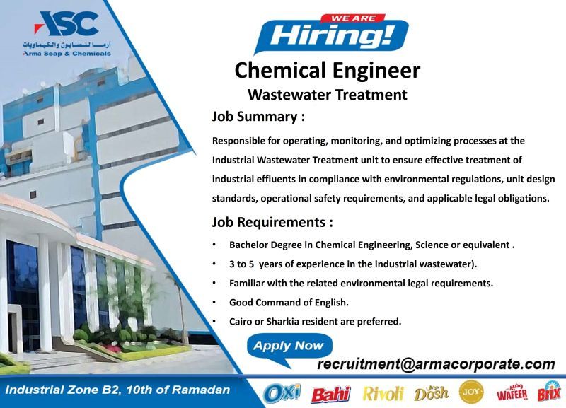 تعلن شركة ISC – Arma Soap & Chemicals عن فتح باب التوظيف لشغل وظيفة مهندس كيميائي متخصص في معالجة مياه الصرف الصناعي للعمل ضمن فريق احترافي في بيئة صناعية متطورة توفر استقرارًا ماليًا وفرص نمو مهني.