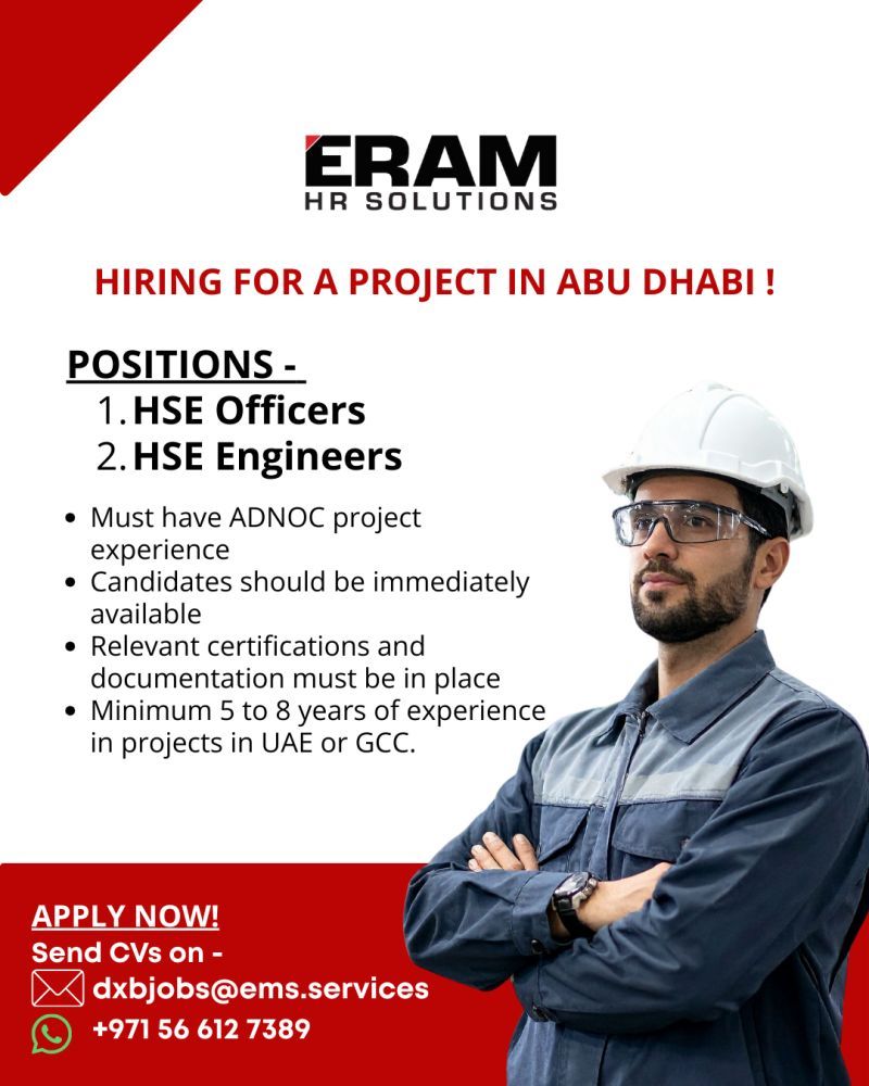 تعلن شركة ERAM HR Solutions عن فتح باب التوظيف للعمل في مشروع كبير في أبوظبي وتبحث عن مهندسين وضباط سلامة بخبرة في مشاريع النفط والغاز داخل الإمارات أو دول الخليج.