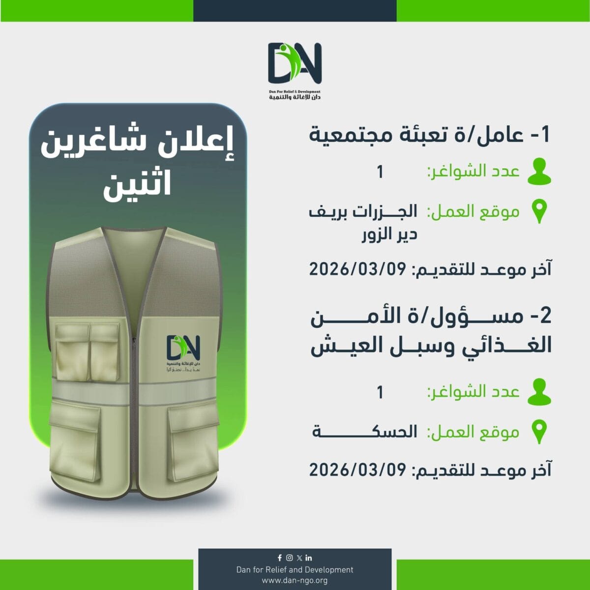 تعلن منظمة DAN للإغاثة والتنمية (Dan for Relief and Development) عن توفر وظيفتين جديدتين للعمل ضمن برامجها الإنسانية في دير الزور والحسكة.