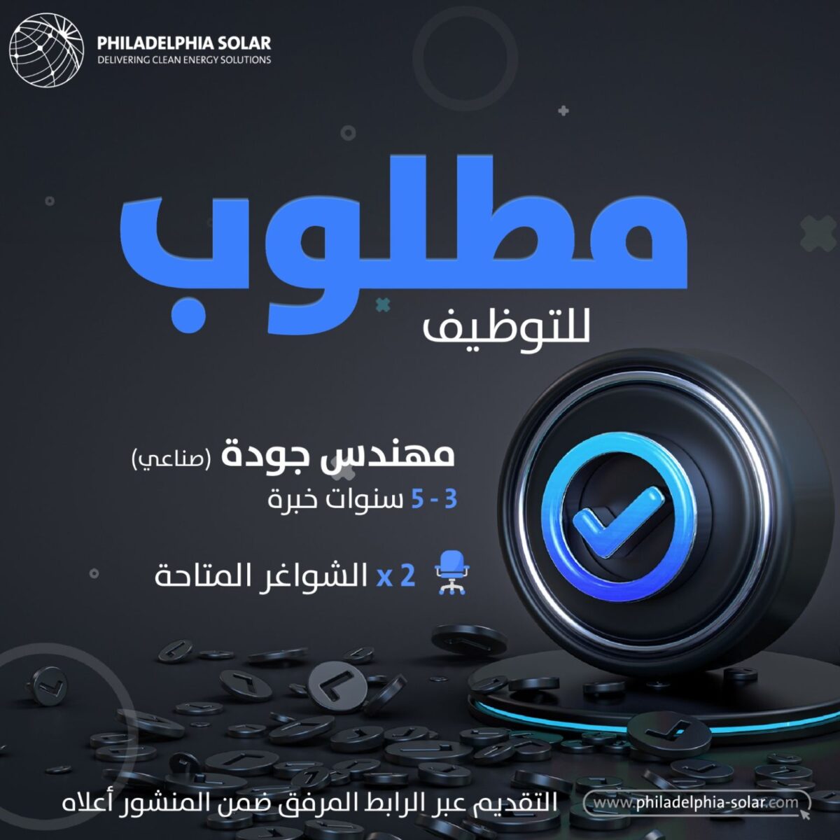 تعلن شركة Philadelphia Solar، الرائدة في حلول الطاقة النظيفة، عن حاجتها لتوظيف مهندس جودة (تخصص هندسة صناعية) للعمل ضمن فريق الجودة.