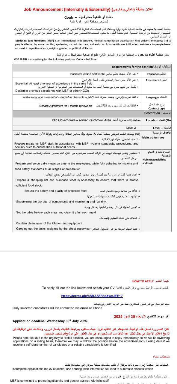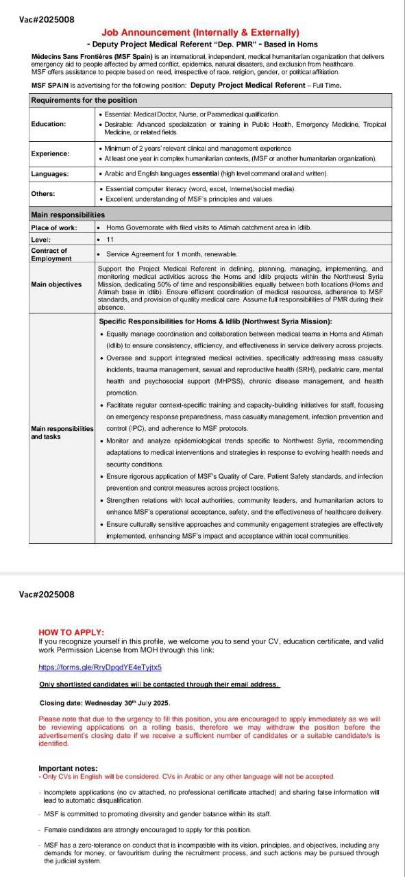 تعلن منظمة MSF عن توفر شواغر وظيفية في محافظتي حمص وإدلب، ضمن جهودها المتواصلة لتقديم خدمات صحية عالية الجودة للمجتمعات المتأثرة.