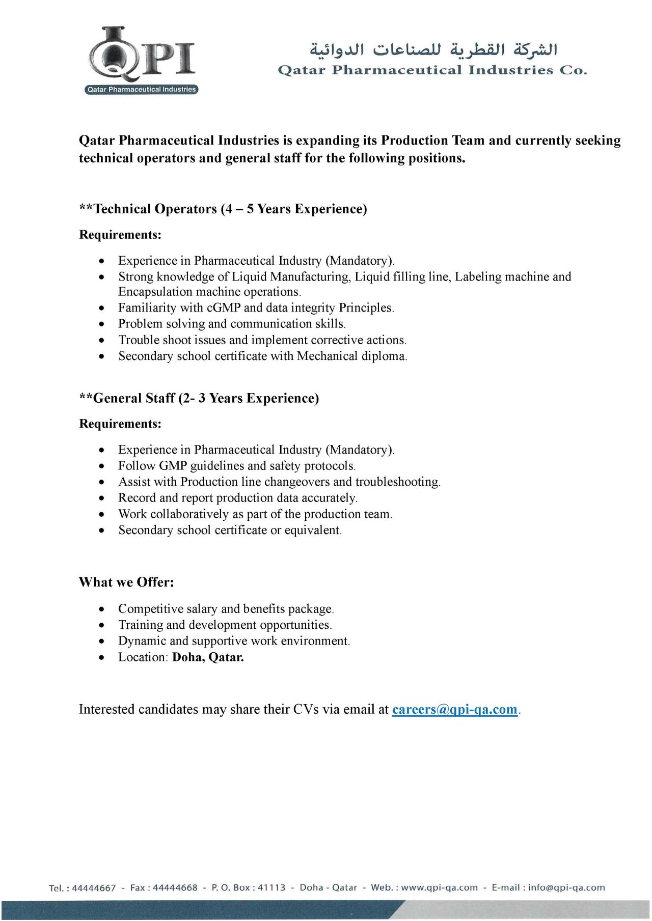 أعلنت شركة Qatar Pharmaceutical Industries Co. عن فتح باب التوظيف لتوسيع فريق الإنتاج لديها في Doha – Qatar.
