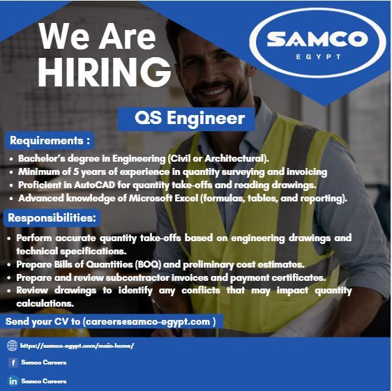 يعد تخصص هندسة الكميات (Quantity Surveying) من التخصصات المطلوبة في قطاع الإنشاءات، حيث يلعب دورًا أساسيًا في إدارة التكاليف وضمان كفاءة تنفيذ المشاريع. العمل في شركة كبيرة مثل سامكو مصر يمنحك خبرة قوية في المشاريع الهندسية ويعزز مسارك المهني في قطاع المقاولات.