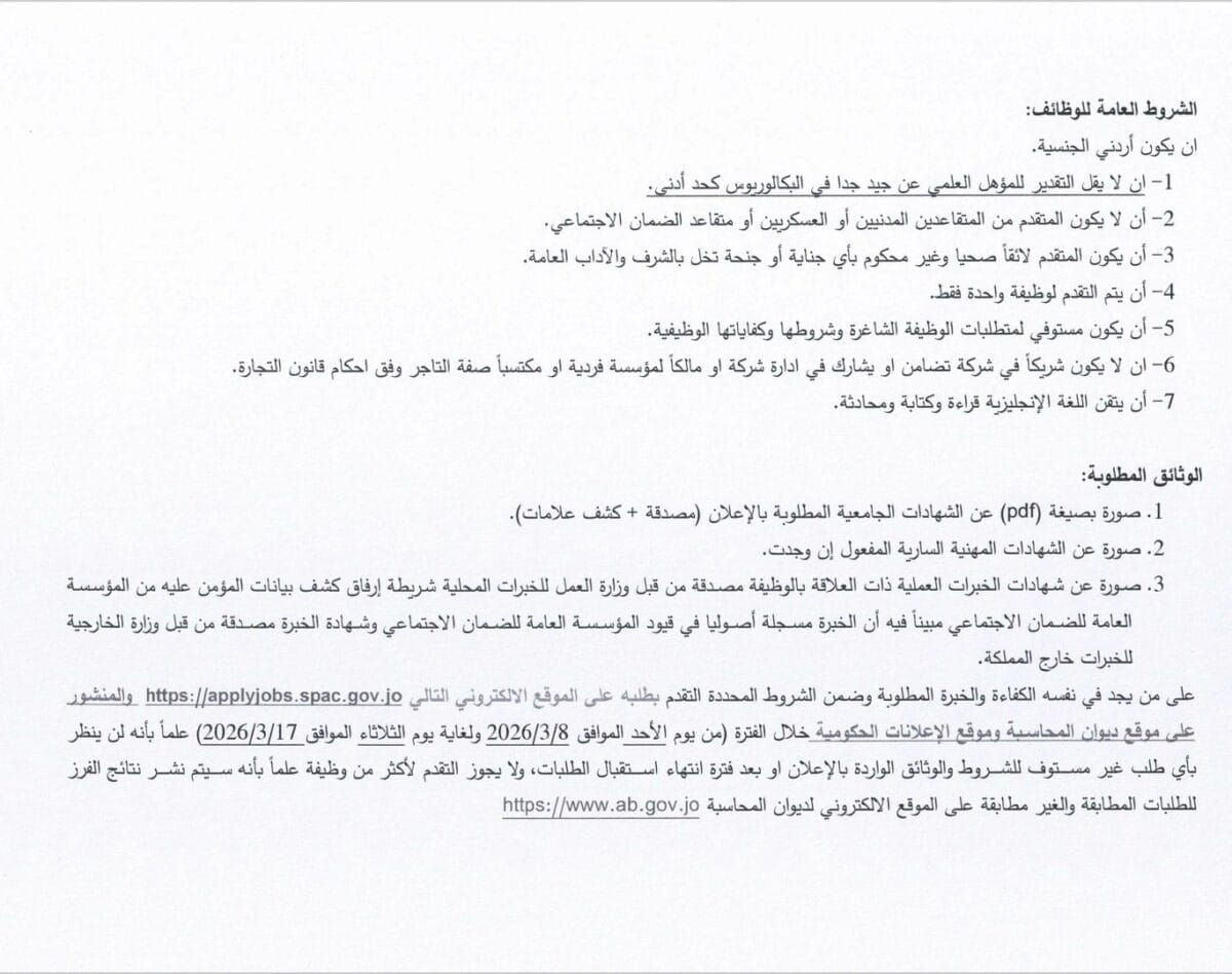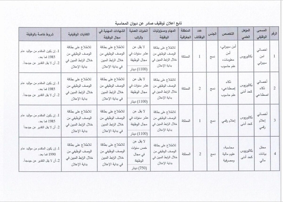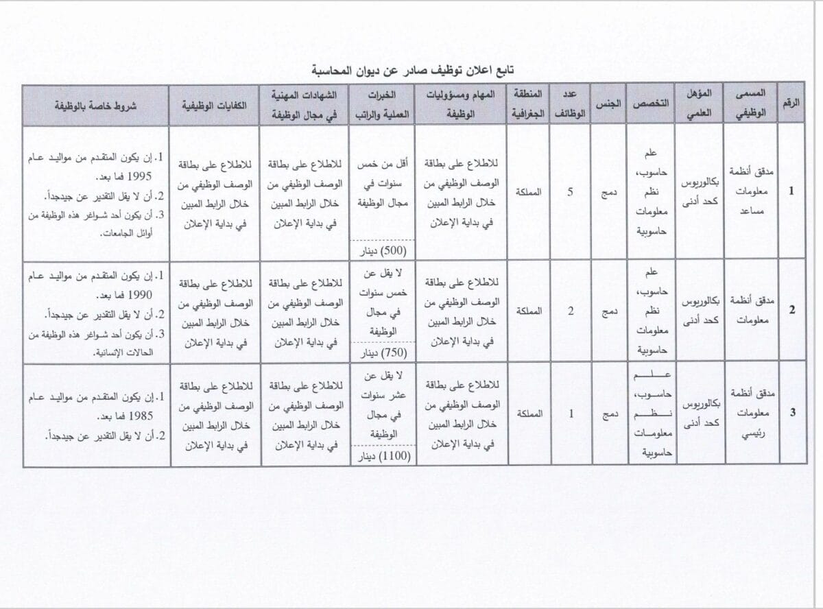 أعلن ديوان المحاسبة في الأردن عن فتح باب التقديم لعدد كبير من الوظائف الحكومية ضمن عقود سنوية محددة المدة في مجالات التدقيق المالي، نظم المعلومات، تحليل البيانات، الإعلام الرقمي، والأمن السيبراني.