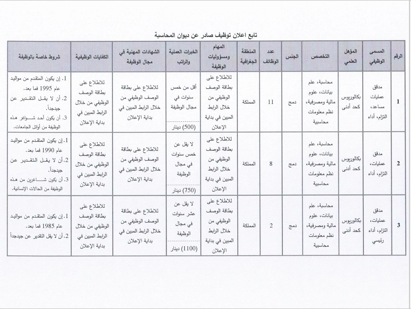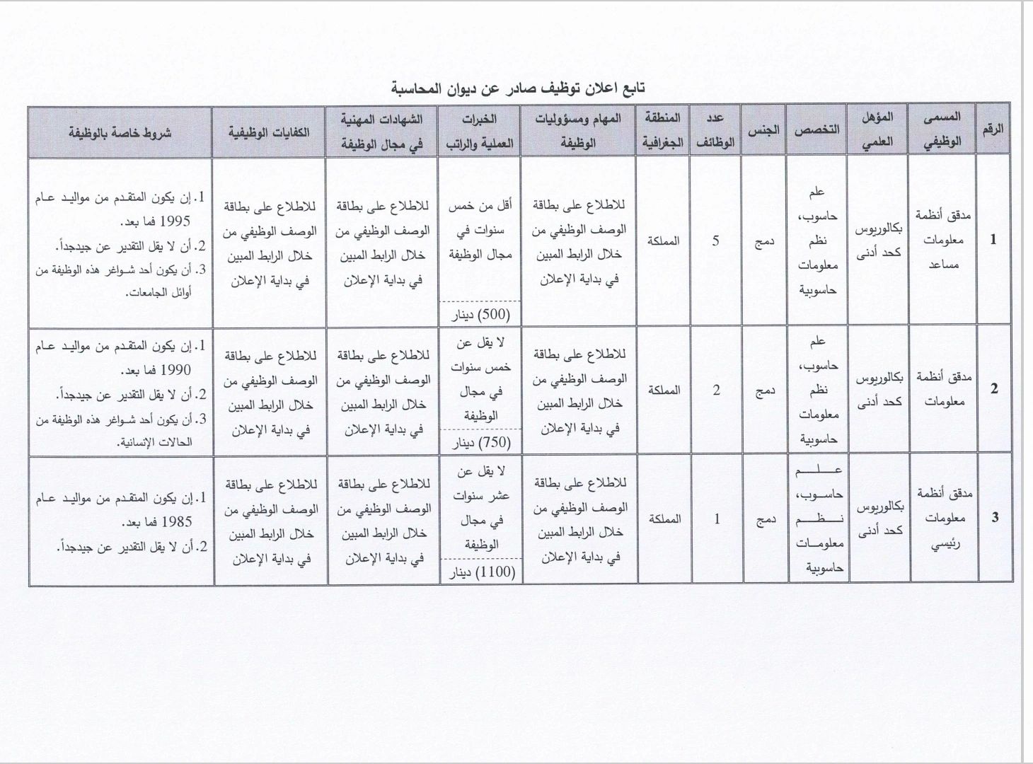 • الرواتب: من 500 إلى 1100 دينار
