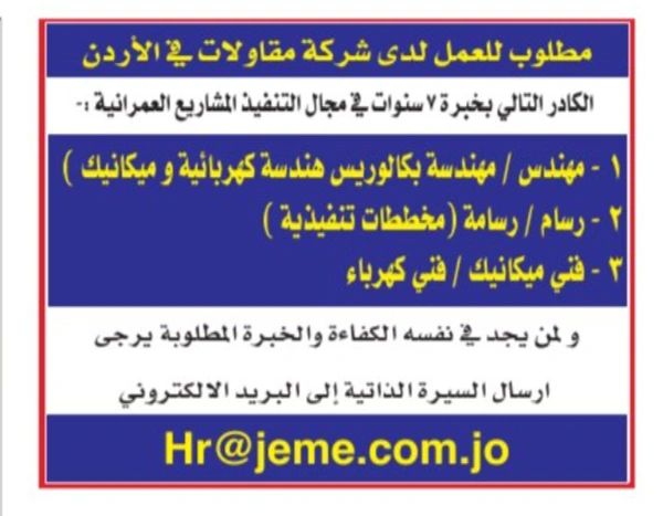تعلن شركة مقاولات رائدة في الأردن عن توفر وظائف هندسية وفنية للعمل ضمن مشاريعها العمرانية، وذلك للكوادر المؤهلة التي تمتلك خبرة عملية في مجال تنفيذ المشاريع الإنشائية.