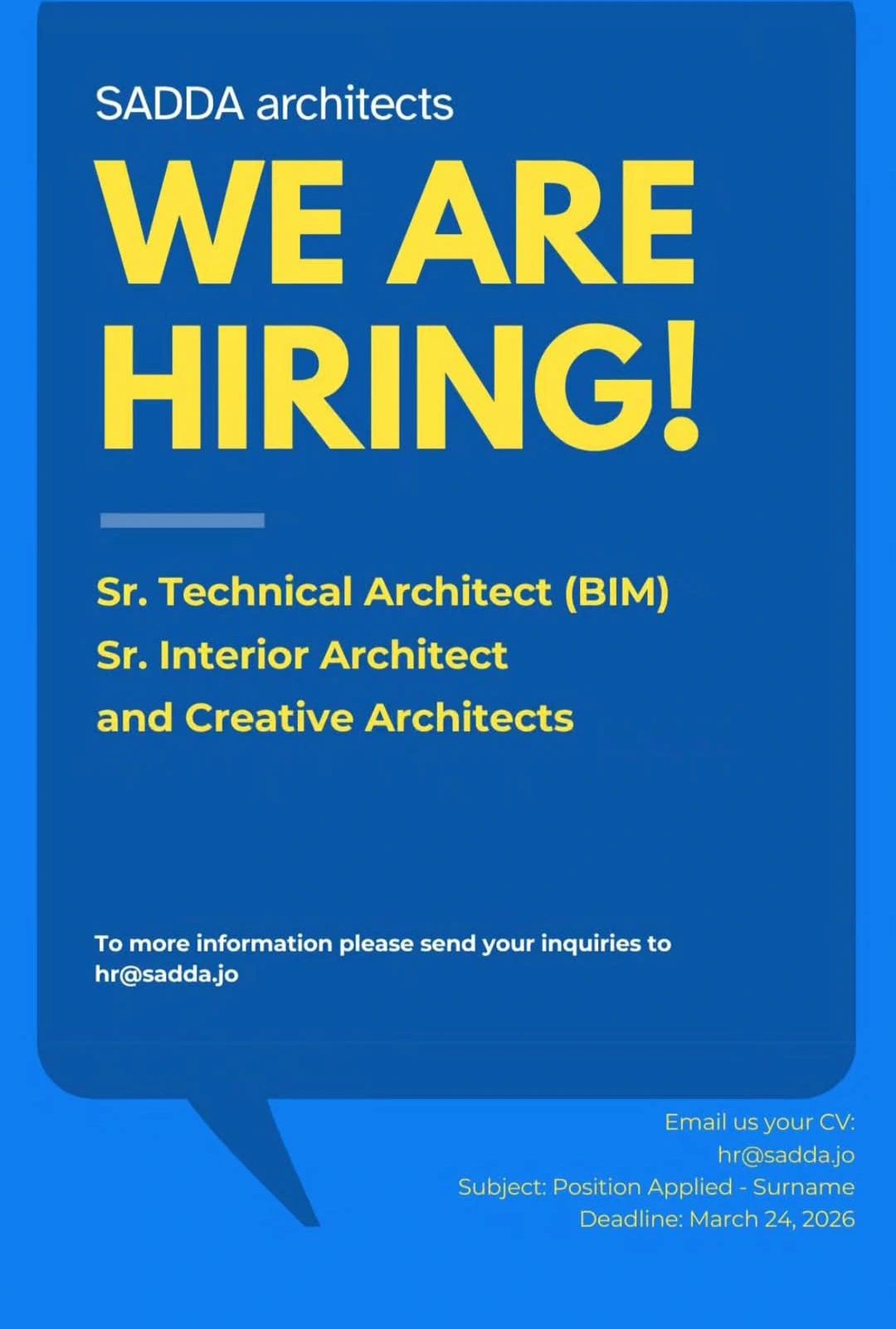 أعلنت شركة SADDA Architects عن فتح باب التوظيف لعدة وظائف هندسية مميزة في مجال العمارة والتصميم. وتبحث الشركة عن مهندسين ذوي خبرة وكفاءة للانضمام إلى فريقها المتخصص في المشاريع المعمارية والتصميم الداخلي.