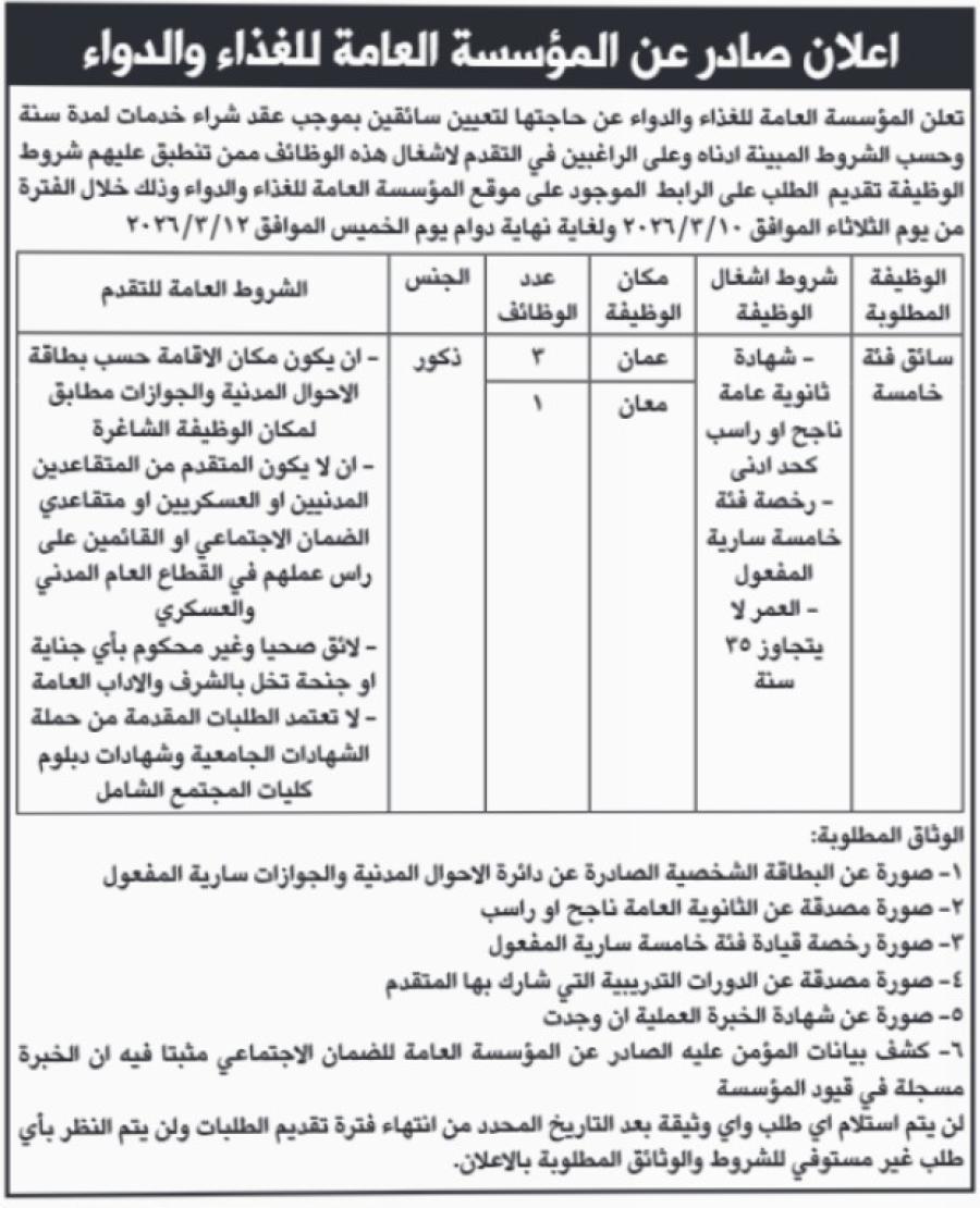 أصدرت المؤسسة إعلان توظيف رسمي لتعيين سائقين للعمل ضمن كوادرها في عدة مواقع داخل الأردن، وفق شروط محددة ومعايير واضحة للتقديم.