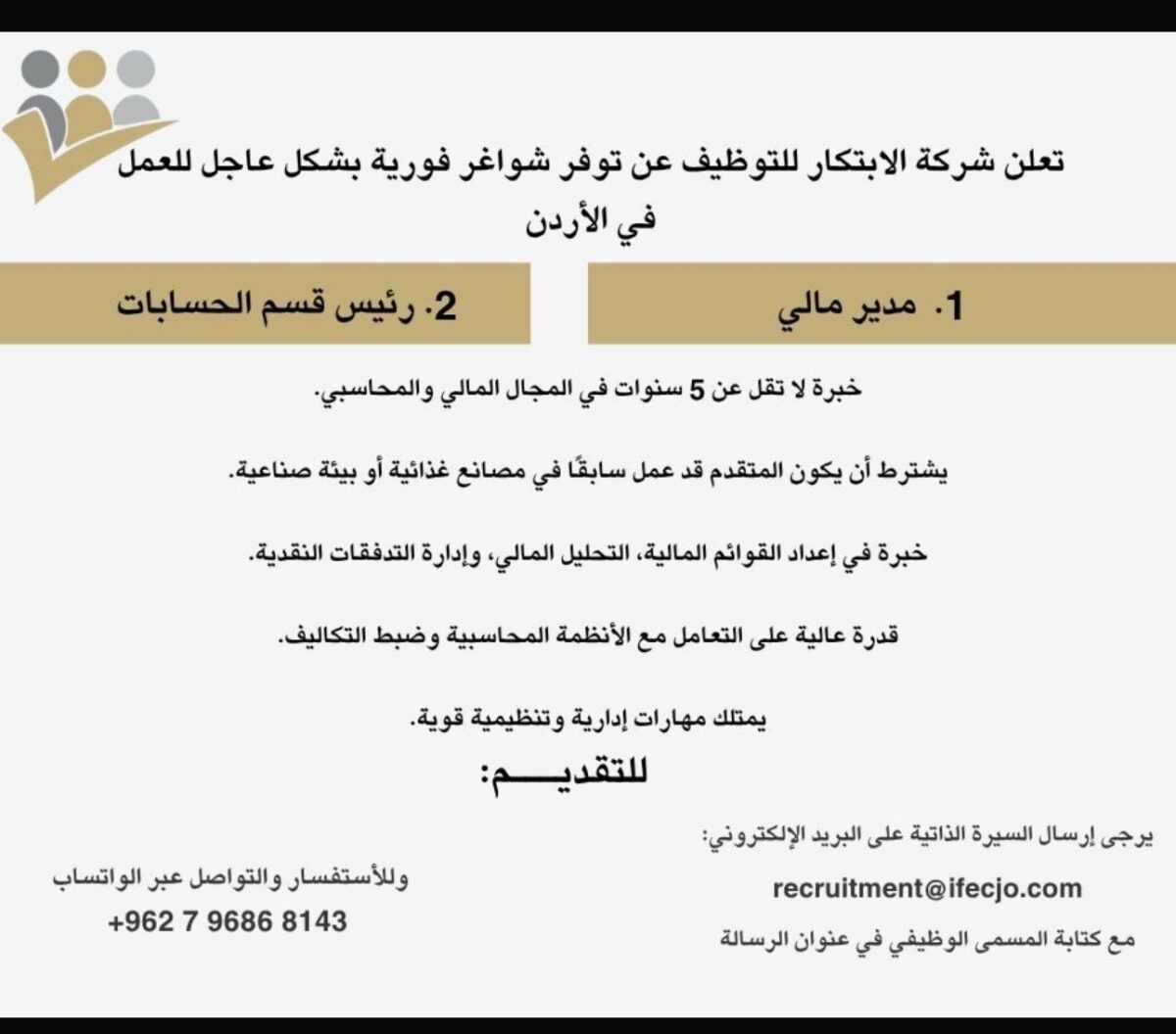 تُعلن شركة الابتكار للتوظيف عن توفر شواغر مالية فورية في الأردن لعام 2025، وذلك للعمل لدى شركة صناعية كبرى.