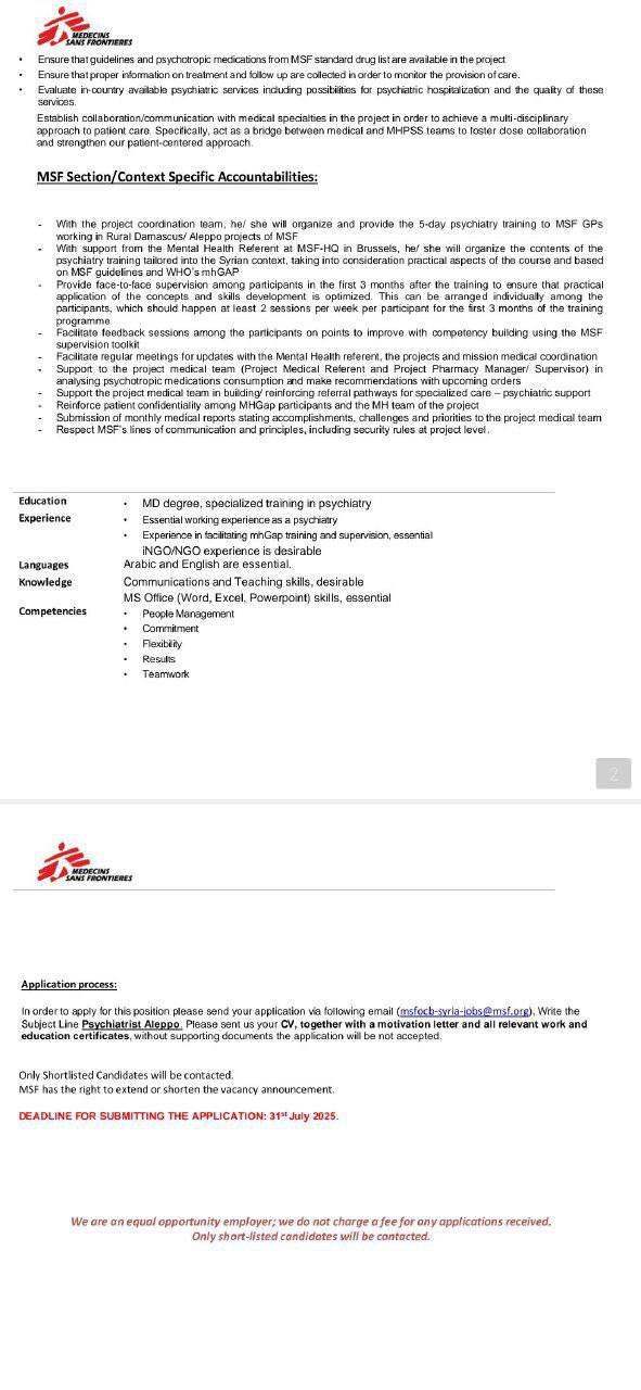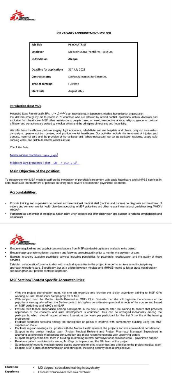 تُعلن منظمة أطباء بلا حدود – بلجيكا (Médecins Sans Frontières – MSF) عن حاجتها لتوظيف طبيب نفسي متخصص للعمل بدوام كامل ضمن مشاريعها في مدينة حلب، سوريا.