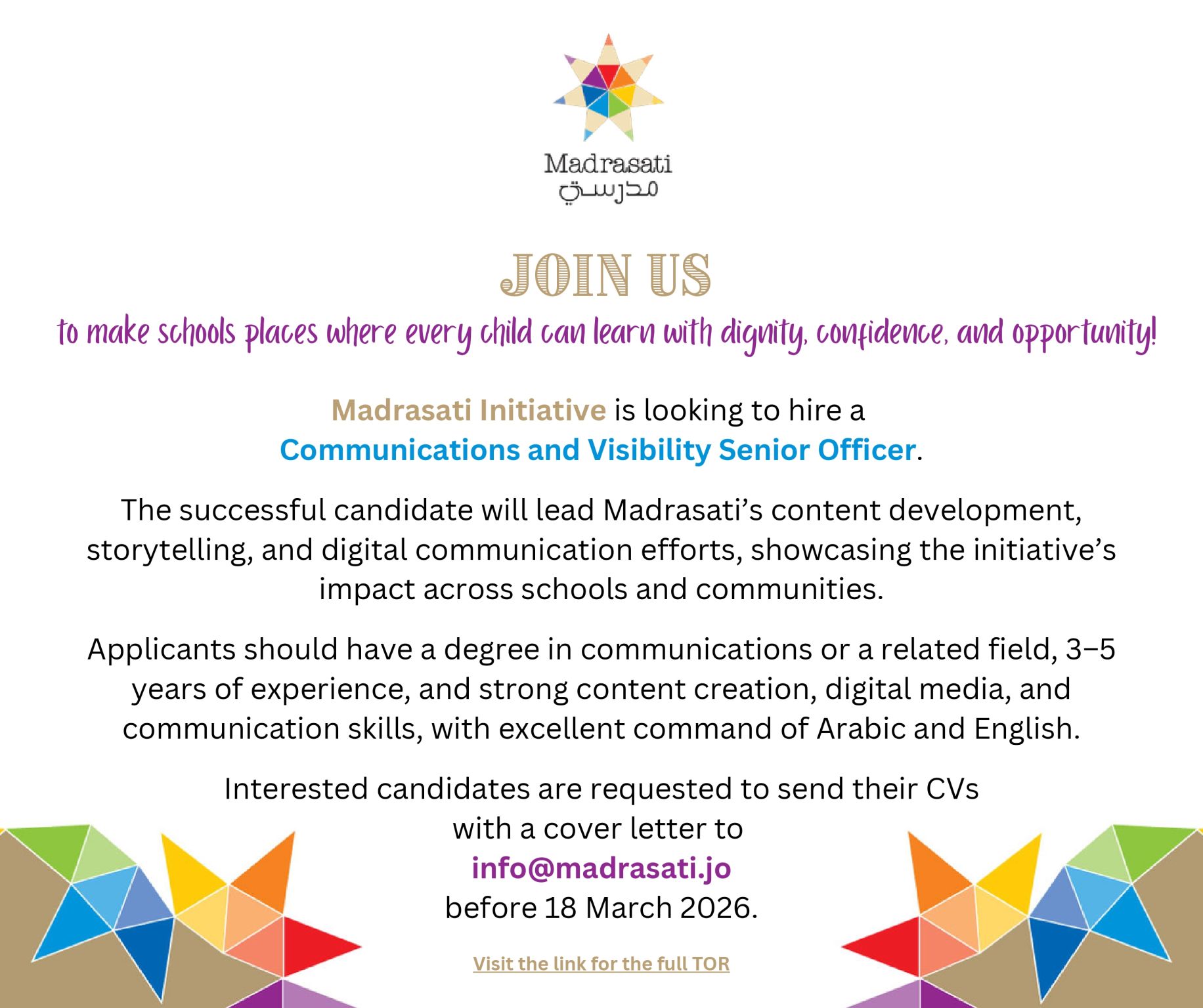 للتقديم على وظائف Communications and Visibility Senior Officer في مبادرة مدرستي يرجى إرسال: