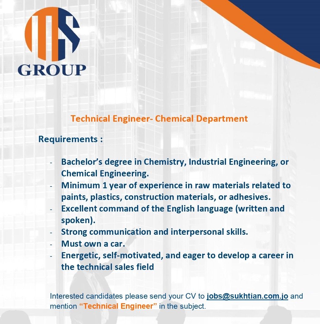 تشهد وظائف الأردن اليوم في القطاع الصناعي والكيميائي طلبًا متزايدًا على الكفاءات الهندسية المتخصصة في الهندسة الكيميائية والمواد الصناعية. وفي هذا السياق أعلنت شركة MS Group عن توفر وظائف شاغرة بمسمى Technical Engineer – Chemical Department للعمل في عمان – الأردن.