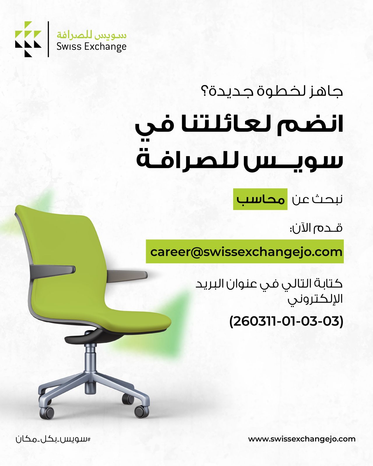 للتقديم على وظائف محاسب لدى شركة سويس للصرافة يرجى إرسال السيرة الذاتية إلى البريد الإلكتروني التالي مع كتابة الكود في عنوان البريد الإلكتروني: