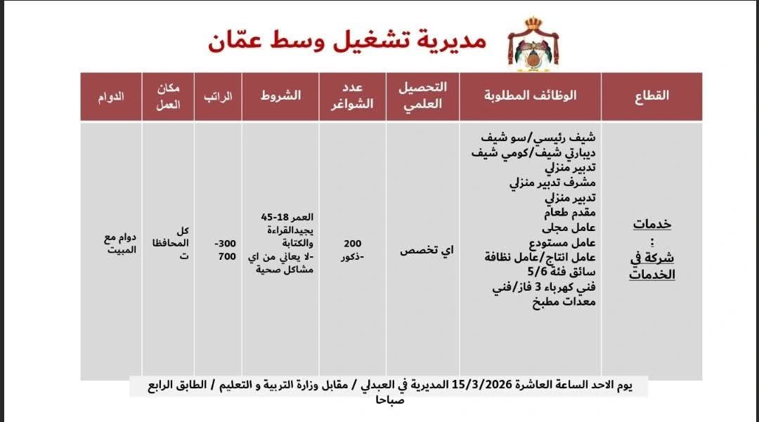 إذا كنت تبحث عن وظائف عمان اليوم أو وظائف الخدمات في الأردن، فقد تكون هذه الفرصة مناسبة لك للانضمام إلى بيئة عمل توفر فرصًا متنوعة في عدة تخصصات.