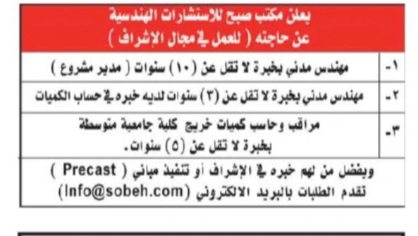 إذا كنت تبحث عن وظائف هندسية في عمّان أو وظائف الأردن اليوم في مكاتب الاستشارات الهندسية، فقد تكون هذه الفرصة مناسبة لك للانضمام إلى بيئة عمل احترافية توفر فرص التطور المهني.