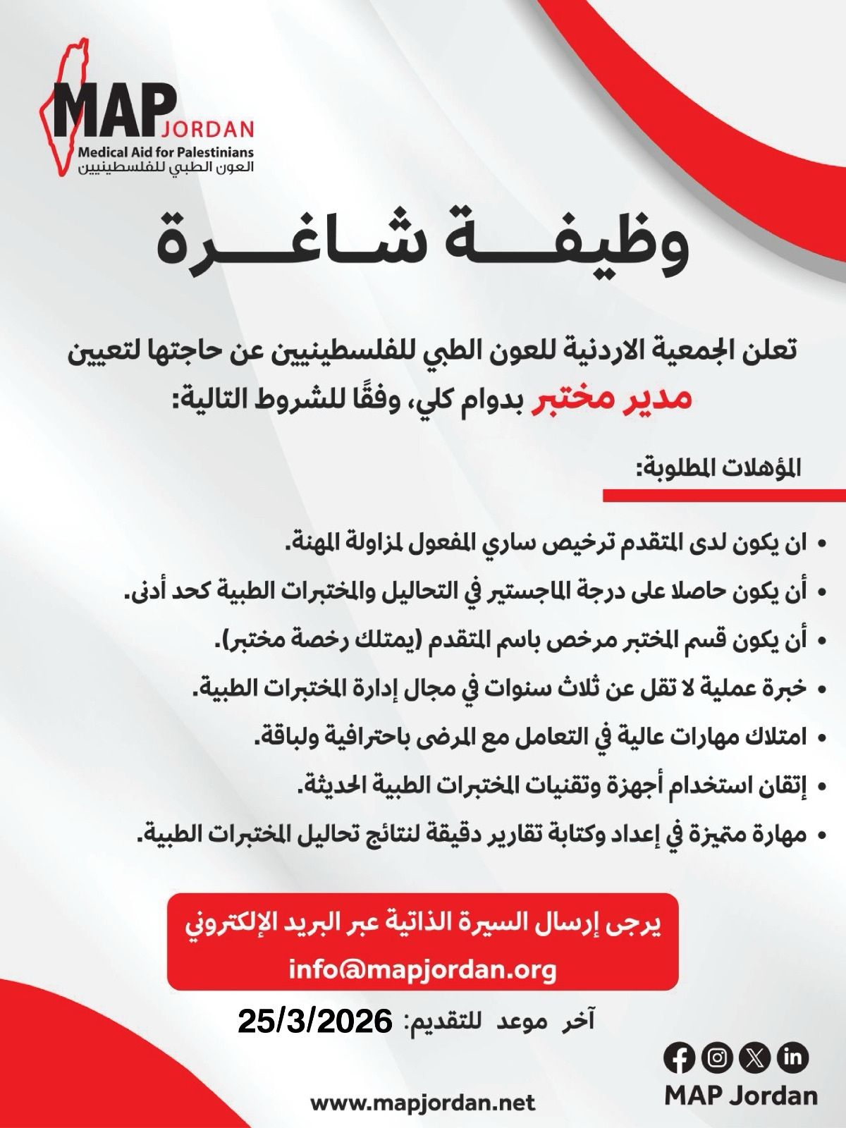 للتقديم على وظائف مدير مختبر في عمّان لدى الجمعية الأردنية للعون الطبي للفلسطينيين يرجى إرسال السيرة الذاتية إلى البريد الإلكتروني التالي: