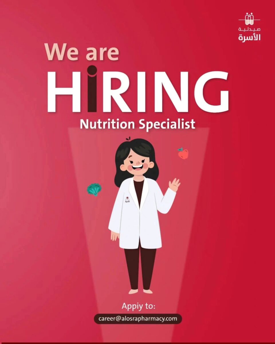 تشهد الأردن استمرار توفر فرص العمل في قطاع الصيدليات والرعاية الصحية، حيث أعلنت سلسلة صيدليات الأسرة عن توفر وظائف أخصائية تغذية وصيدلانية للعمل ضمن فروعها في عمّان والزرقاء.