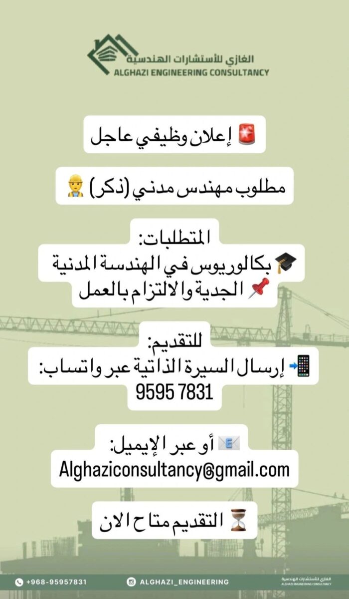 كما تعد هذه الفرصة مناسبة للباحثين عن وظائف شركات هندسية في عمان والراغبين في تطوير مسيرتهم المهنية في مجال الهندسة المدنية وإدارة المشاريع.