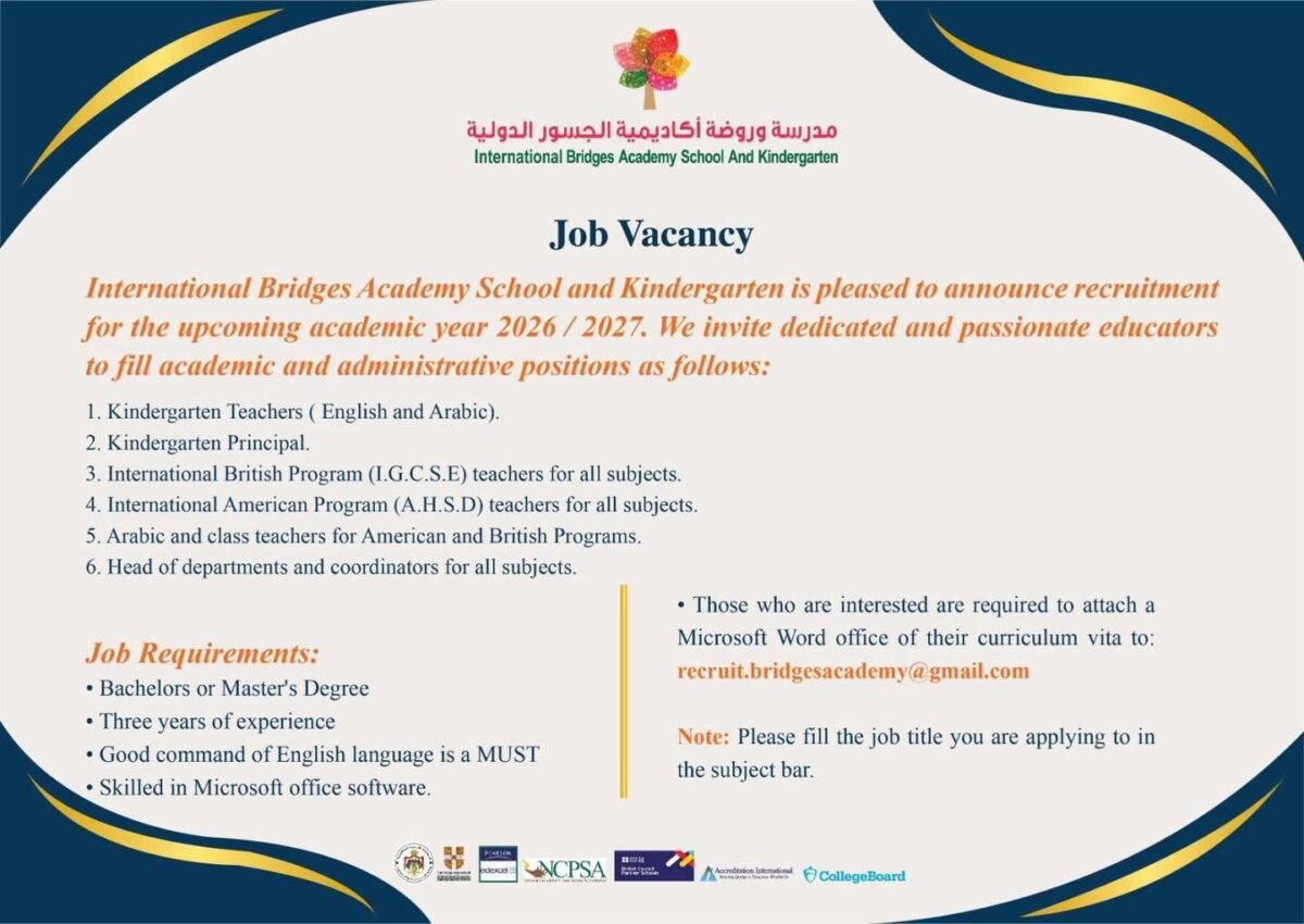 تشهد الأردن تطورًا ملحوظًا في قطاع التعليم الدولي، حيث أعلنت مدرسة وروضة أكاديمية الجسور الدولية عن توفر وظائف تعليمية وإدارية للعام الدراسي 2026 – 2027.