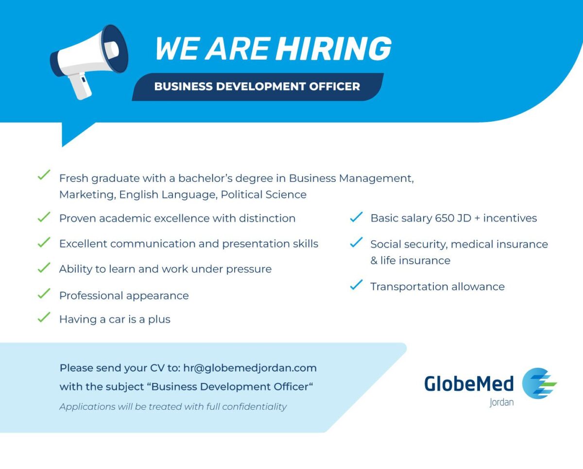 تعلن شركة GlobeMed Jordan عن حاجتها لتعيين “موظف تطوير أعمال” في عمّان للعام 2025