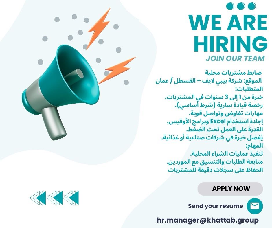 تعلن شركة بيبي لايف – القسطل / عمّان عن توفر فرصة وظيفية لتعيين “ضابط مشتريات محلية” للعام 2025.