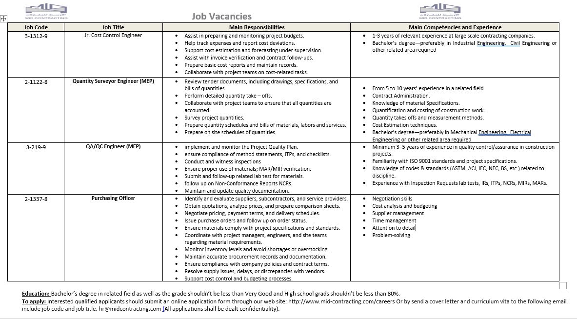 للتقديم على وظائف MID Contracting في الأردن يجب توفر: