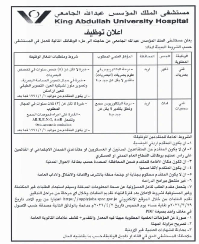 📄 يعلن مستشفى الملك عبدالله الجامعي في إربد عن توفر وظائف صحية شاغرة لحملة البكالوريوس في تخصصات طبية محددة، مع فرص عمل في بيئة طبية متقدمة داخل الأردن.