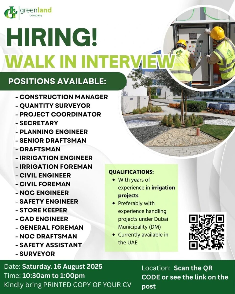 تعلن شركة Greenland عن فتح باب التوظيف لوظائف عدة في قطاع البناء ومشاريع الري في الإمارات، من خلال مقابلة شخصية (Walk-In Interview) بتاريخ 16 أغسطس 2025.