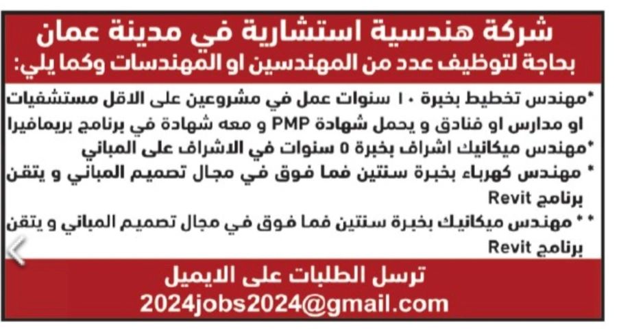 🏷️ وظائف مهندسين في عمّان لدى شركة هندسية استشارية