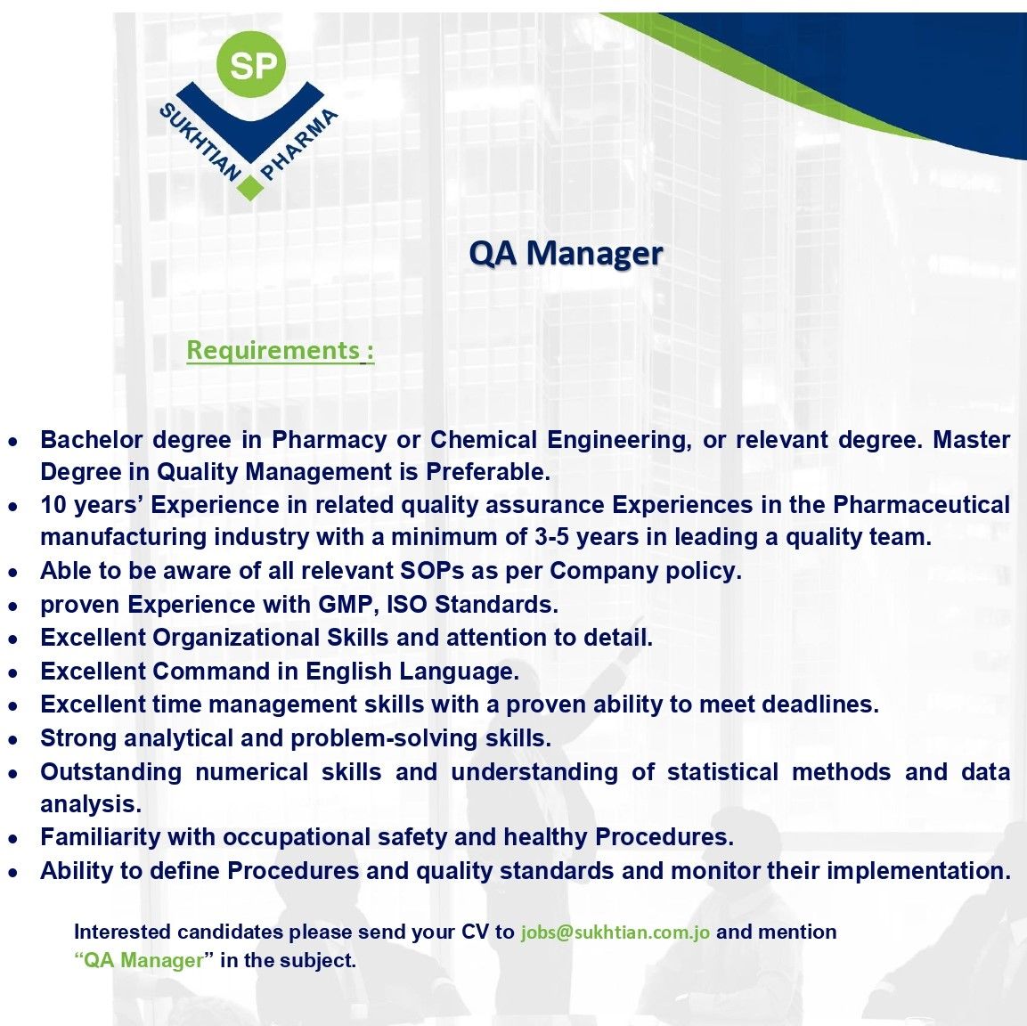 🏷️ مدير ضمان الجودة في عمّان لدى شركة Sukhtian Pharma