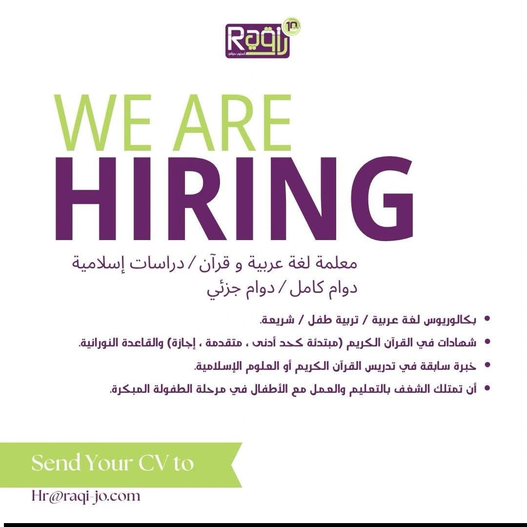 📄 فرصة عمل معلمة لغة عربية وقرآن ودراسات إسلامية في الأردن لدى أكاديمية راقي بدوام كامل أو جزئي ضمن بيئة تعليمية متخصصة
