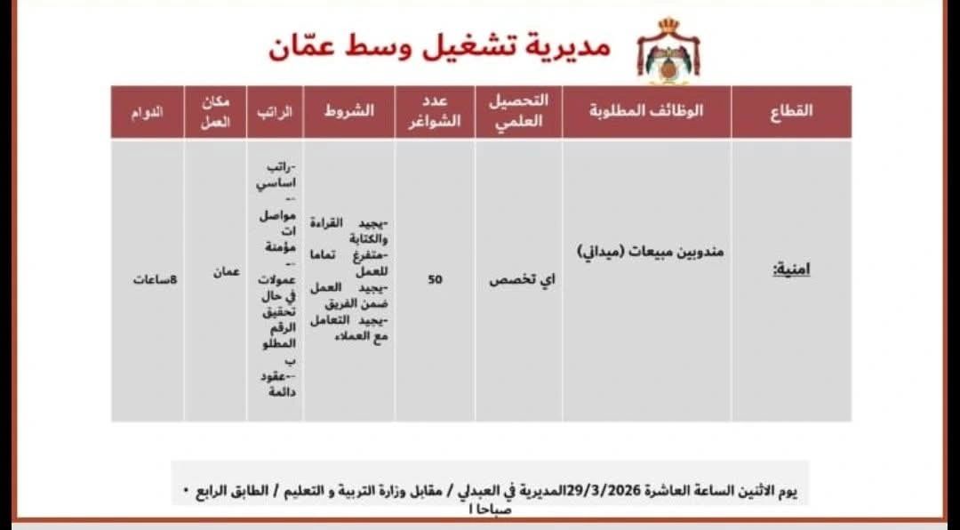 📄 فرصة عمل مهندسي مبيعات مبتدئين في عمّان لدى مديرية تشغيل وسط عمان بعدد 50 شاغر مع مزايا تشمل راتب أساسي ومواصلات